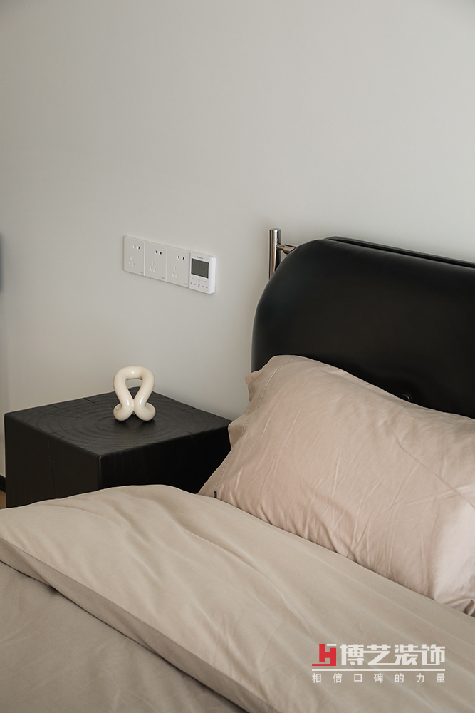 主臥將簡約風(fēng)做到了極致,整墻的按壓式儲物柜,不同于拉手式衣櫥,讓柜體更隱形,視覺上增加空間感。簡易的撞色桌椅,在恬靜的空間中雜糅一抹動感紅棕,讓整個臥室環(huán)境更具層次。